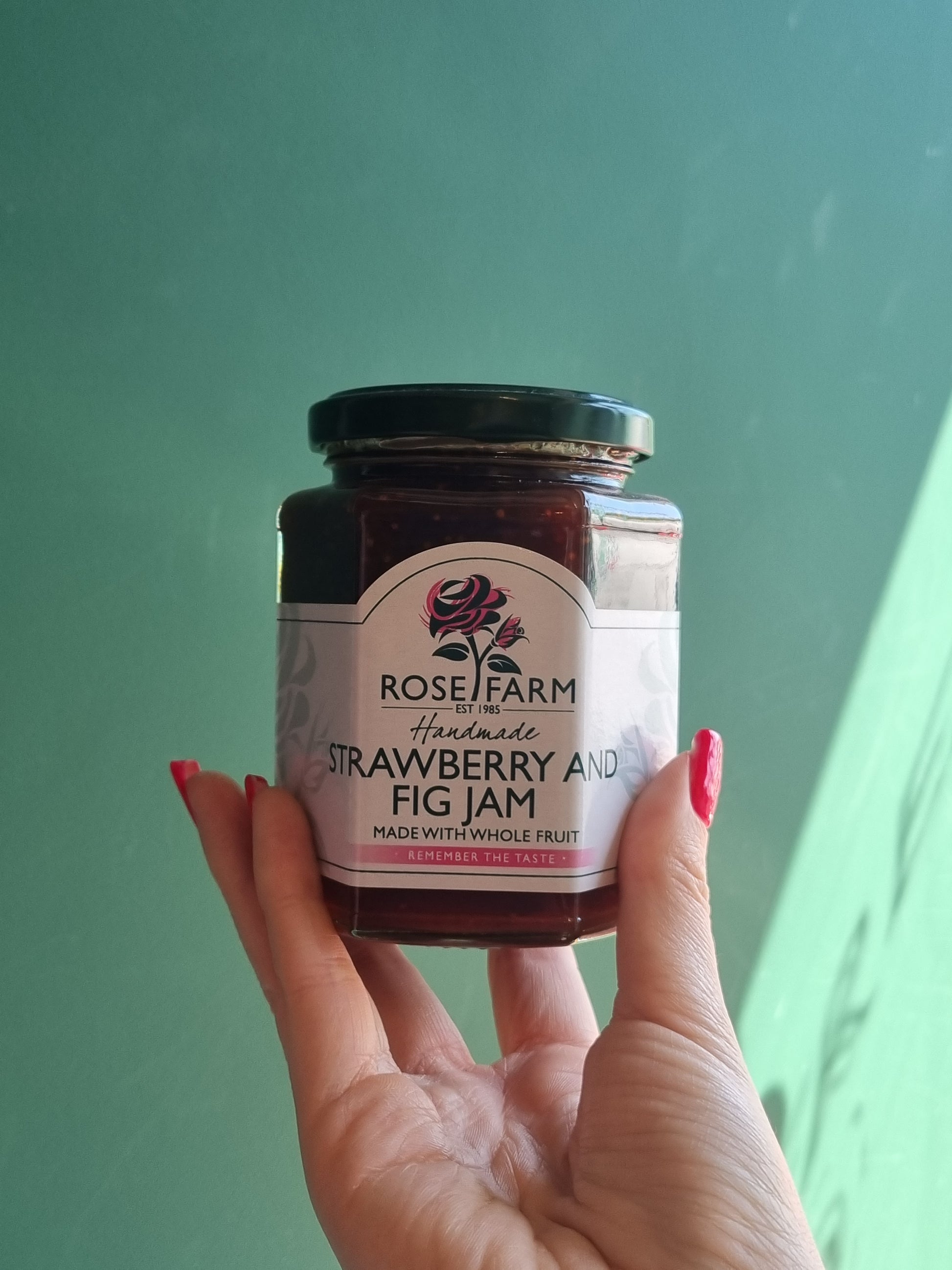 Handmade strawberry and fig jam from Rose Farm, Somerset.